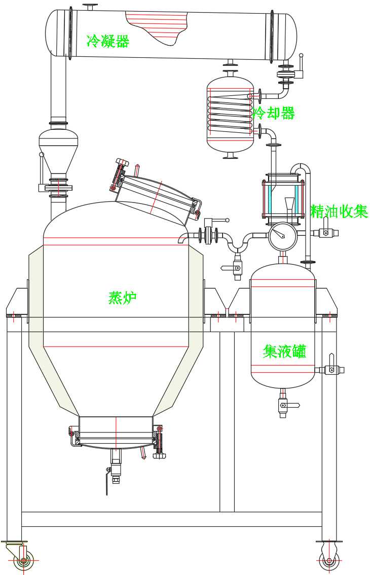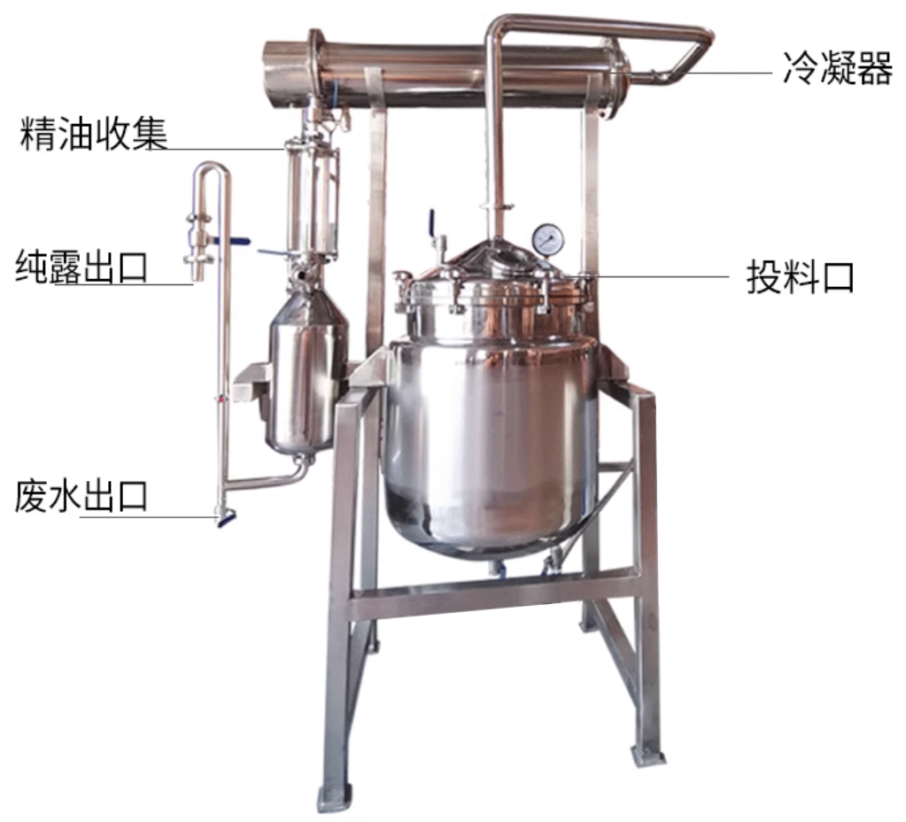 工藝流程:開啟加水,可隔水蒸餾,也可共水蒸餾,開電加熱或蒸汽,水沸騰產生蒸汽,蒸汽透過提取機內物料,隨及將精油純露析出,精油純露蒸汽沿排汽管上